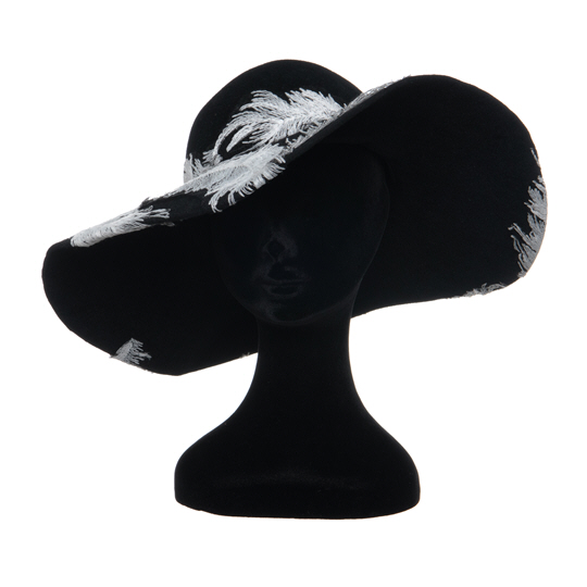 £125Quality large brim 60s style felt overlaid with slightly off white embroidered feather motifs which randomly wrap slightly under the brim